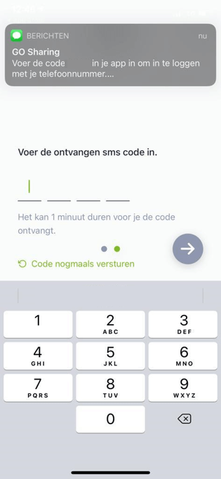 Go-Sharing stuurt je nu een sms om te verifiëren of jij het bent, vul de code in die je ontvangt.