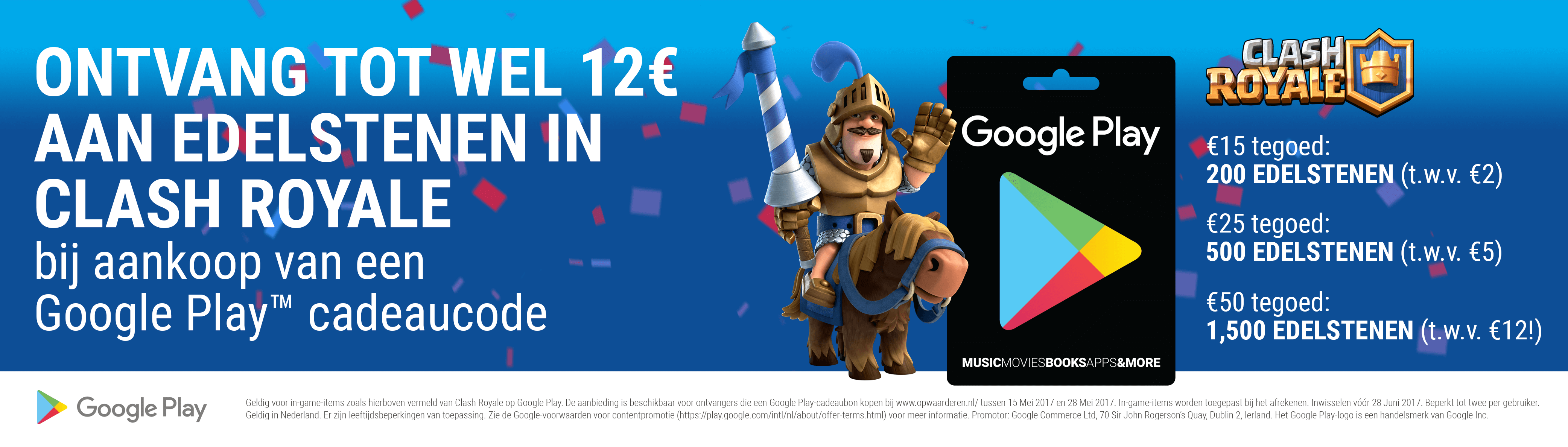 Het komt erop neer dat je met een grote hoeveelheid edelstenen dus sneller verder komt in het spel. Daarom moet je van deze actie profiteren: ’Clash Royale Edelstenen Actie’. Je krijgt bij elke waarde extra edelstenen! Koop je een €15 Google Play card, dan krijg je 200 edelstenen extra (t.w.v. €2). Koop je een €25 Google card, dan krijg je zelfs 500 edelstenen extra (t.w.v. €5). Wil je helemaal profiteren van deze actie? Dan koop je een €50 Google code, want dan krijg je maar liefst 1.500 extra edelstenen (t.w.v. €12)!