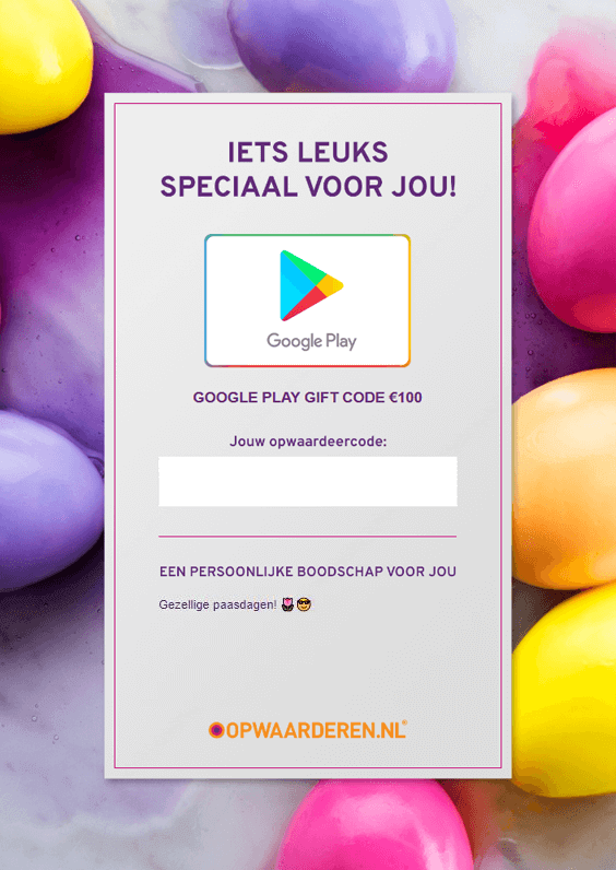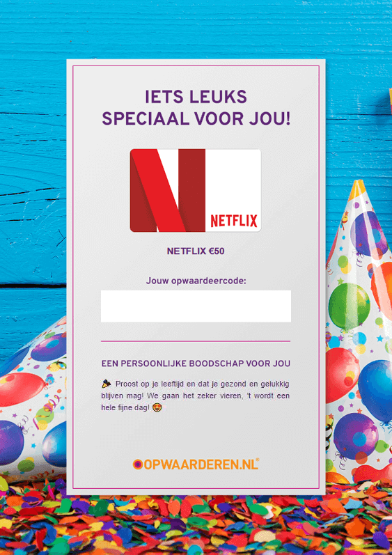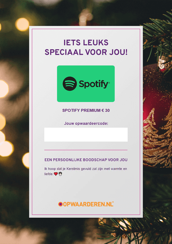 De digitale cadeaukaart is perfect voor iedere gelegenheid! In een handomdraai maak je een gepersonaliseerde PDF cadeaukaart die je daarna eenvoudig kan delen. Voeg eerst een persoonlijke boodschap toe en kies daarna een leuke bijpassende achtergrond. Zo zijn er bijvoorbeeld achtergronden voor Pasen, Kerstmis en verjaardagen, maar ook achtergronden die perfect zijn voor je vriend(in)! De kaart is dus aan te passen voor iedere gelegenheid. Als je een cadeaukaart wilt maken, druk je bij het gewenste product op de knop "Als cadeau bestellen".